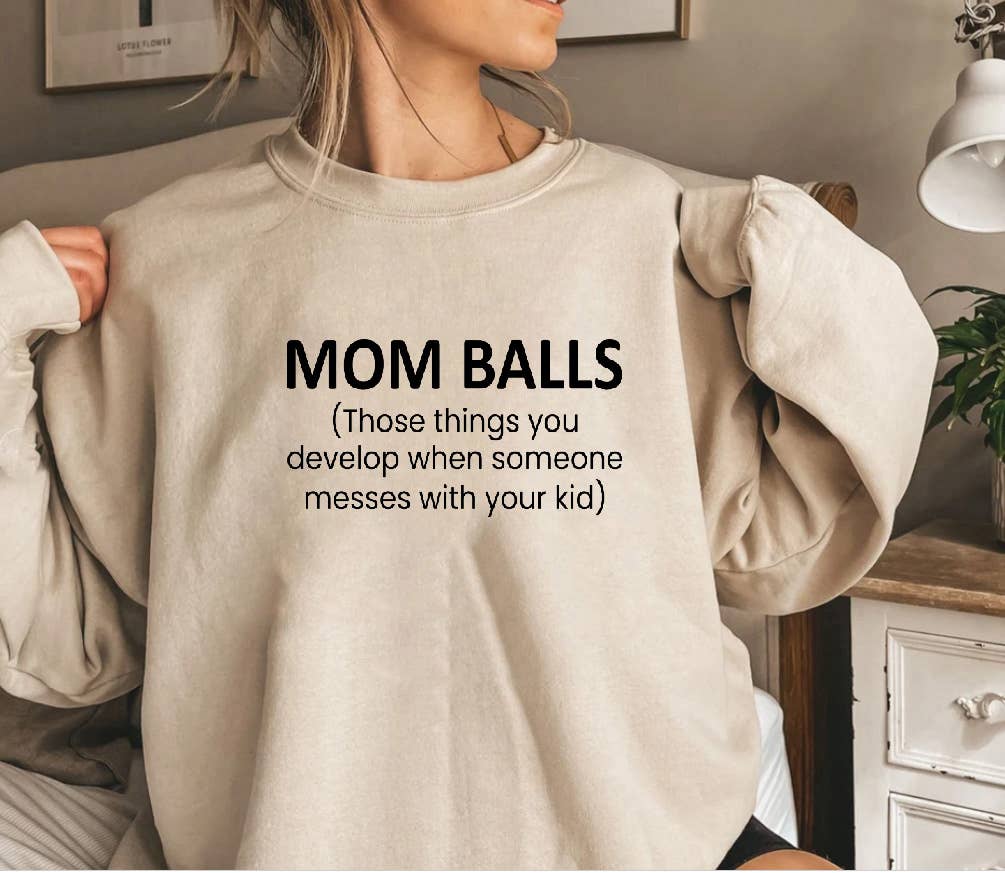 Mom Balls Sweatshirt, Mom Hoodie, Gift for Mom, Funny Sweater, Mom Life Sweatshirt, Funny Sweater for Mom, Mothers Day Sweater, New Mom Gift ** product ** This COZY & COMFY sweatshirt is an adult unisex crewneck made from a cotton/poly blend. There are no itchy side seams, it is super soft . Unisex Crewneck Sweatshirt 8 oz./yd?? (US) 13.3 oz./L yd (CA), 50/50 cotton/polyester, 20 singles Heather Sport colors: 60/40 polyester/cotton Unisex size Classic fit Air jet yarn for softer feel and reduced pilling Double-needle stitching at shoulders, armholes, neck, waistband and cuffs 1x1 rib with spandex for enhanced stretch and recovery Tear away label * You can inquire about the color you want. Please contact us. * CARE INSTRUCTIONS -- Machine wash cold on delicate cycle and lay flat to dry. Do not bleach/dry-clean. Do not iron directly onto the design.